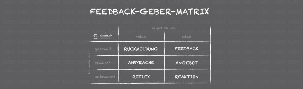 Den Begriff Feedback empfehle ich jedoch nur mit einem systematischen und geschulten Vorgehen zu verbinden. Geschult heißt hier übrigens, auf beiden Seiten gleich oder ähnlich geschult, bei Feedbackgeber und bei Feedbacknehmer. Paradoxerweise erlebe ich immer wieder, dass Menschen in Führungsverantwortung zu dem Thema im besten Falle Grundlagen vermittelt bekommen haben – die Feedbackgeber jedoch nicht. Wie soll das gut zusammen gehen – und etwas förderliches bewirken?