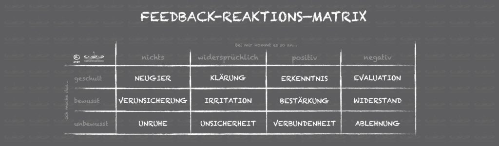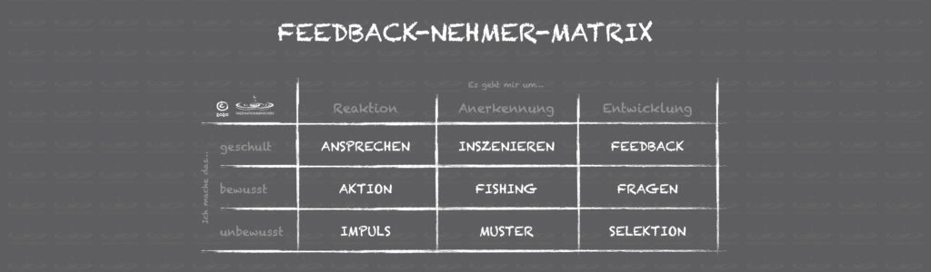 Auf Feedbacknehmerseite kommt in Sachen Feedback zu der Dimension ‚unbewusst bis geschult‘ der noch wichtigere Teil der Motivation hinzu – also ob ich einfach nur eine Reaktion anstrebe, Anerkennung möchte oder offen bin, für meine Entwicklung etwas zu tun. Demgemäß tauchen hier vertraute Muster auf, wie das Fishing for compliments, die selektive Wahrnehmung sowie die Inszenierung.