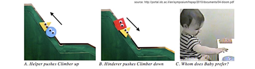 Lange bevor wir es lernen oder gezeigt bekommen könnten, entdecken wir als Babies, was uns ganz impulsiv und ohne Befangenheit Freude bereitet und glücklich macht. Wir erkunden alles mit allen Sinnen und kennen keine Tabus. Wir haben sogar schon von Geburt an ein glückliches Gefühl für soziales Verhalten. Das berühmte Experiment mit Babies im Alter von 6 Monaten, ist ein deutlicher Indikator, dass wir ein angeborenes Belohnungssystem für soziales Verhalten haben. Was passiert bei dem Experiment? Eine gelbe dreieckige Figur versucht mühsam einen Berg raufzukommen. Die blaue runde Figur hilft der gelben Figur dabei, den Berg raufzukommen, die rote eckige Figur drückt die gelbe Figur den Berg runter. Im Anschluss werden alle Babies an einen Tisch gesetzt und vor ihnen liegt eine blaue runde Figur – und eine rote eckige Figur. Alle Babies greifen bevorzugt zur blauen Figur.