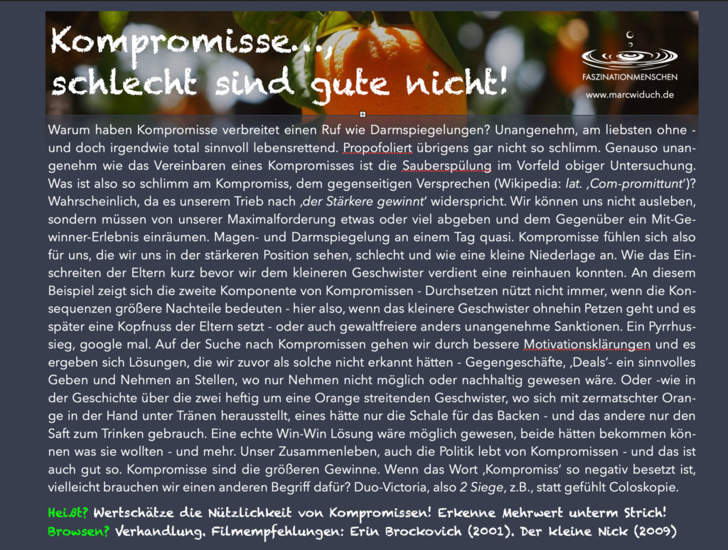 …schlecht sind gute nicht! Warum haben Kompromisse einen so schlechten Ruf? Dabei machen sie unser Leben aus, sind Grundlage von Zusammenleben und Demokratie. Hier in diesem OnePager kurz und knackig provokant Inspirationen zum Thema Kompromisse und deren Vereinbarung.
